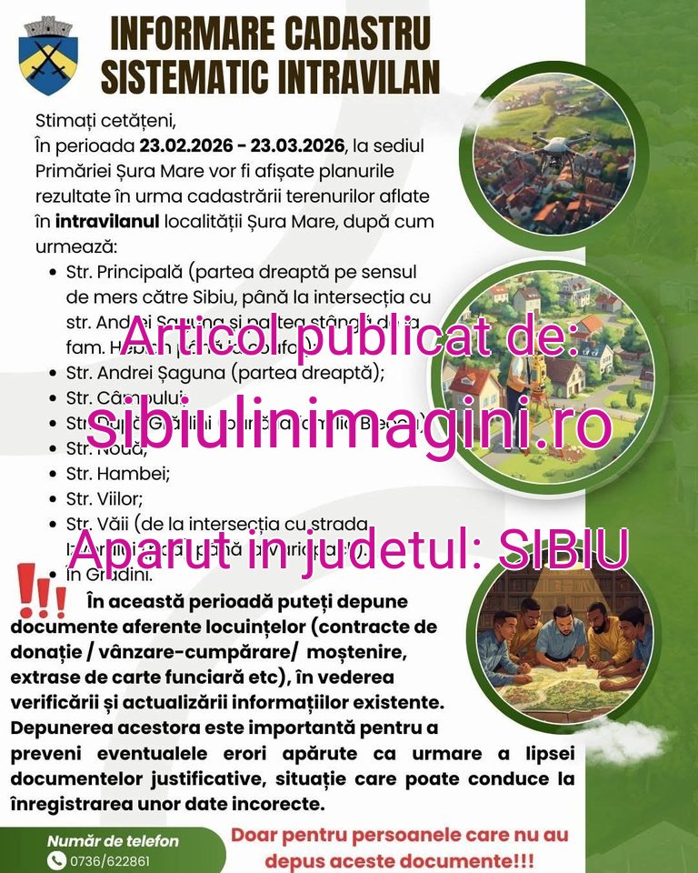 Primăria comunei Șura Mare anunță că, în perioada23 februarie – 23 martie 2026 , persoanele care nu și-au depus încă documentele aferente locuințelor (contracte de donație, vânzare-cumpărare, moștenire, extrase de carte funciară etc.) pot să le transmită autorităților pentru verificarea și actualizarea informațiilor cadastrale.