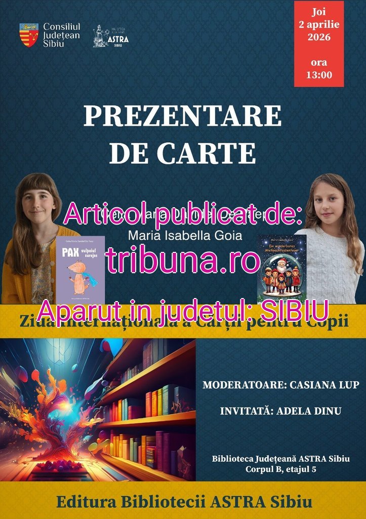 Joi, 2 aprilie 2026, începând cu ora 13:00, în spațiul American Corner Sibiu, situat la etajul V al bibliotecii, va avea loc prezentarea cărților „Pax, vulpoiul curajos”, de Celia Maria Davidel de Paep și „Ein wunderbares Weihnachtsabenteuer” („O minunată aventură de Crăciun”), de Maria Isabela Goia, tipărite la Editura Bibliotecii ASTRA. Alături de reprezentanții editurii, la eveniment va fi prezentă Adela Dinu, profesoară de limba și literatura română, iar rolul de moderatoare îi va reveni Casianei Lup, elevă a Colegiului Pedagogic „Andrei Șaguna” din Sibiu. Intrarea este liberă pentru public.